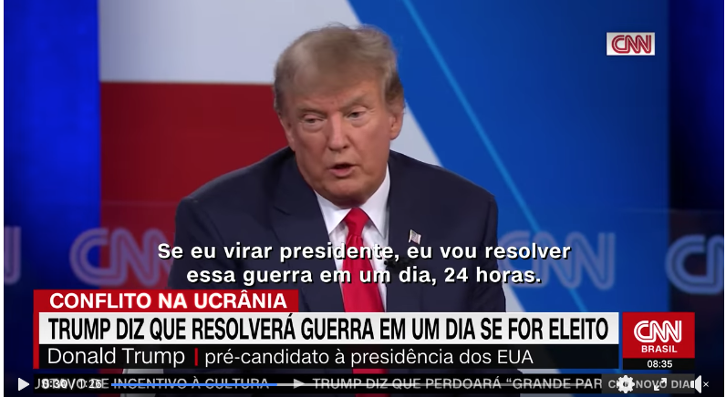 O ex-presidente dos Estados Unidos Donald Trump afirmou, em uma sabatina feita pela CNN, que resolveria a guerra entre Rússia e Ucrânia “em um dia” caso retornasse à Casa Branca nas eleições de 2024. Ele se recusou a dizer como faria isso